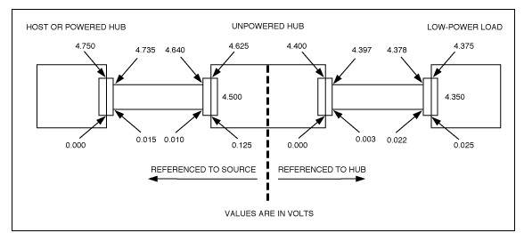 當(dāng)USB端口帶有一個(gè)總線供電的USB集線器,集線器上接了低功耗設(shè)備時(shí),USB口上允許的直流電壓跌落如圖1所示。大功率負(fù)載與總線供電的集線器連接時(shí),電壓跌落將超過圖1給出的指標(biāo),并會(huì)引起總線過載。