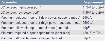 在符合USB 2.0規(guī)范的主機(jī)中,大功率端口的上游端具有120uF、低ESR電容。所連接的USB設(shè)備的輸入電容限制在10?F以內(nèi),在最初的負(fù)載連接階段,允許負(fù)載從主機(jī)(或自供電集線器)吸取的最大電荷數(shù)為50?C。這樣一來,當(dāng)新設(shè)備連接至USB端口時(shí),上游端口的瞬態(tài)電壓跌落小于0.5V。如果負(fù)載正常工作時(shí)需要更大的輸入電容,則必須提供浪涌電流限制器,以保證對(duì)更大的電容充電時(shí)電流不會(huì)超過100mA。