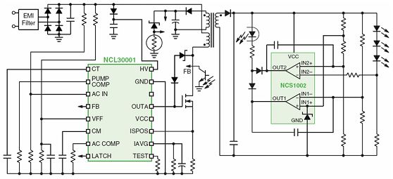 區(qū)域照明應用除了采用分布式/模塊化方案之外,還可采用整體式/單段式方案。例如可以采用安森美半導體的NCL30001功率因數(shù)校正TRIAC可調光LED驅動器。