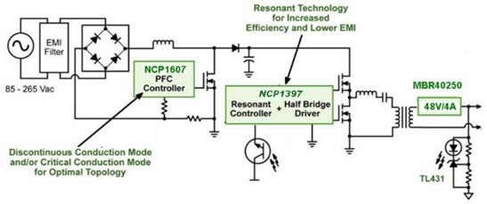 LLC拓撲結構采用串聯(lián)類型的諧振轉換器,能在相對寬的輸入電壓和輸出負載范圍下工作。此外,由于諧振儲能元件可以部分或完全集成在主變壓器中,LLC拓撲結構只需要數(shù)量有限的元器件。再加上在所有負載條件下,LLC拓撲結構的初級開關都能工作在零電壓開關條件,次級整流器都能工作在零電流開關條件。所以,LLC拓撲結構是高性價比、高能效及優(yōu)化了電磁干擾的解決方案。