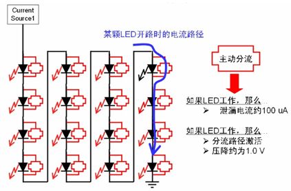 區(qū)域照明應用中通常會采用多串LED,雖然LED本身可靠性高,但若LED串中的某個LED開路,那么整串LED就可能關閉,而街道照明等應用中必須避免這種狀況,從而降低后期維護成本。為了增強LED串的可靠性,這種安森美半導體推出了NUD4700 LED電流旁路保護器。NUD4700器件是一款分流器件,當LED串中某個LED開路時,就會提供電流旁路,確保整串LED不會關閉;而且恰當處理散熱的話,還可支持大于1 A的大電流,其工作原理如圖8所示。