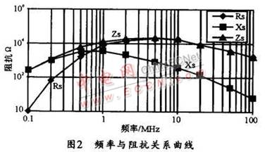 EMI 濾波器需要抑制的頻率范圍通常在10kHz~50 MHz之間。為了使共模濾波電路在此頻率范圍內都能提供適當的衰減,磁芯在此頻率范圍內的阻抗必須都要很高。共模磁芯的總阻抗(Zs)由串聯感性阻抗 (Xs)和串聯阻性阻抗(Rs)兩部分組成。在低頻部分,磁芯阻抗主要以感性阻抗為主,隨著頻率的增加,阻性阻抗逐步增加,漸漸起主要作用,圖2所示是頻率與阻抗的關系曲線。圖中,兩種阻抗的結合,可使磁芯在此全頻范圍內提供合適的總阻抗(Zs)。