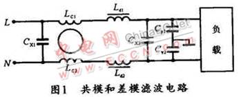 開關電源的開關頻率及其諧波的主要表現是電源線上的干擾,稱之為傳導干擾。傳導干擾分為共模干擾和差模干擾。共模干擾是由載流導體與大地之間的電位差產生的,其特點是兩條線上的干擾信號電壓是同電位同相的;而差模干擾則是由載流導體之間的電位差產生的,其特點是兩條線上的干擾信號電位相同,但相位相反。事實上,針對不同的干擾信號,EMI濾波電路也分為抗共模干擾濾波電路和抗差模干擾濾波電路,圖1所示是其濾波電路。