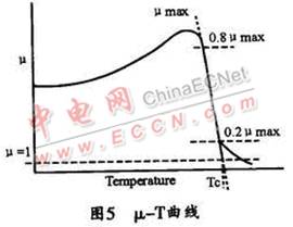 選擇電感的磁芯材料不但要考慮其磁特性,還要考慮其溫度特性,包括高低溫下的磁性變化和磁性材料的居里溫度特性。磁芯由鐵磁性(亞鐵磁性或反鐵磁性)轉變成順磁性的溫度稱為居里溫度。在圖5所示的 μ-T曲線上,80%μmax與20%μmax連線與μ=1的交叉點相對應的溫度,即為居里溫度Tc。