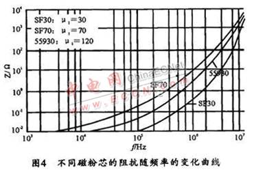 圖 4所示是Magnetic公司的SF30與SF70金屬磁粉芯及55930鎳鐵磁粉芯的頻率一阻抗變化曲線。不同磁性能的磁芯,其阻抗與頻率變化是不一樣的。由圖4可以看出,鐵磁粉芯SF70和鎳鐵磁粉芯55930在干擾頻率小于2 kHz時,其阻抗很小且基本不變,表示對這一頻段的干擾信號衰減很小。鐵磁粉芯SF30在小于60 kHz時,對干擾信號的衰減也很小,但到2 MHz附近的吸收則迅速增強,在接近10 MHz時吸收最強,而SF70在100kHz以后曲線的斜率變化不大。由此可見,不同性能的材料對干擾信號的吸收頻段也不一樣。因此在實際設計中,必須根據實際所需抑制的干擾信號頻段進行磁芯材料的選擇。