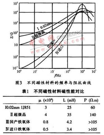 共模電感線圈如圖l中Lcl,Lc2是繞在一只磁芯上的兩組獨立的線圈,所繞圈數相同,繞向相反。這樣,當EMI濾波器接入電路后,兩組線圈產生的磁通在磁芯中將相互抵消,故不會使磁芯飽和。對于干擾信號而言,共模磁芯一般工作在低磁場區域,所以,共模濾波電感選用的磁性材料要求具有較高的初始磁導率μi。如果只針對濾波器的插入損耗這一指標,則初始磁導率μi越高,濾波電路呈現的感抗就越大,所得到的插入損耗指標就越好。但在整個電路中,還要綜合考慮磁性材料在電路中的其它特性,如頻率阻抗特性、居里溫度、磁材的形狀等等。μi值不同的各種磁性材料,在不同頻率下的阻抗特性也不一樣,故要根據所需要的頻率范圍來選取合適μi值的磁性材料。圖3所示是不同類型的高μi軟磁材料在同樣條件下的頻率與阻抗關系曲線,該曲線反映出電感磁芯的插入損耗變化趨勢。其它的性能參數(如電感值、體電阻等)如表1所列。
