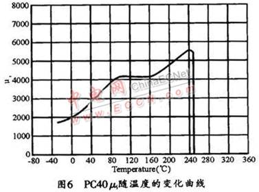 中小功率的EMI濾波器產品中選用最多的磁芯材料是日本TDK公司 的PC40 (它是目前業界廣泛使用的較好的材料之一),它的初始磁導μi隨溫度的變化曲線如圖6所示。從圖中可看出,溫度變化對μi的影響是很大的,磁芯溫度在 90~150℃的區間內,有一段平坦區,這時它的μi大約在4100左右;當溫度低于90℃后,μi值會隨著溫度的降低而逐漸減小,到0℃時,μi值只有 2000左右,進到負溫區后,μi值還會進一步減??;而當溫度高于150℃后,μi值則會隨著溫度的升高而增加,當達到240℃時,μ的最大值為5600 左右;從240℃開始,μi值又漸漸減小,當溫度達到居里溫度點250℃時,材料失去磁性。