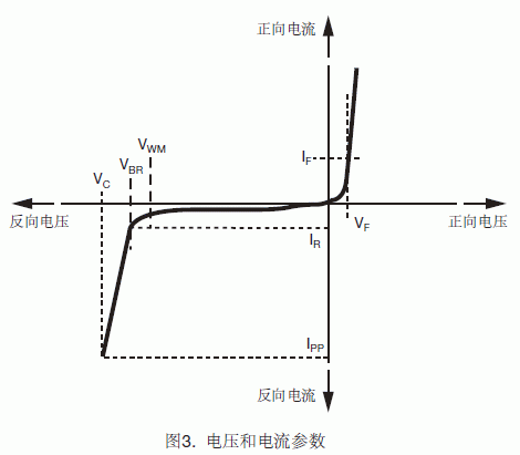 在特定的峰值脈沖電流定額下,TVS上會出現鉗位電壓。TVS的擊穿電壓在非常小的電流下測得(例如1mA或10mA),它不同于應用條件下的實際雪崩電壓。因此,半導體制造商所標注的是在大電流下的典型或最大擊穿電壓。