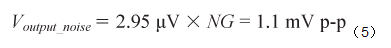 跨導放大器的輸入噪聲應乘以此增益。ADA4505-2的0.1 Hz至10 Hz輸入電壓噪聲為2.95 μV p-p,因此輸出端的噪聲為: