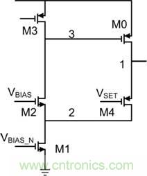 因此,輸出電壓對溫度和工藝變化極為敏感。要避免這種問題,就必須創建一個更為理想的跟隨器,其中 M4 是反饋環路的一部分(圖3)。