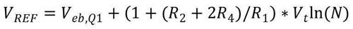 通過添加雙極性晶體管的負溫度系數基射極間電壓,可獲得帶隙電壓的低溫系數,從而可通過在不同電流密度下偏置的兩個基射極間電壓之差獲得正溫度系數電壓。為電阻器R2和R3選擇相等的值,參考電壓就可表示為公式5:
