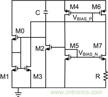 偏置發生器通常不需要特別啟動電路,這可減少靜態電流和占用面積。如果電流足夠小,電阻R 就可以忽略。由M5/M7和M4/M6構成的兩個電流鏡可互連成一個閉環。
