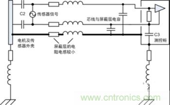 4)此處電機平臺和測控柜已有接地,通過傳感器連接線屏蔽層又將兩者連接,形成地環(huán)路。然而實際工程應(yīng)用中地環(huán)路往往不可避免地存在,本例中若沒有屏蔽層依然會通過C2、電纜和C3產(chǎn)生高頻地環(huán)路,從這方面看屏蔽層改變了環(huán)路路徑。