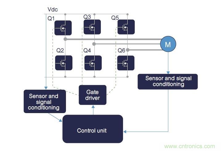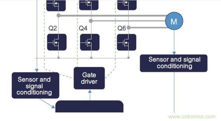 在電橋拓撲內,反向恢復過程從下橋臂開關(圖7中的Q2)續流結束時開始,到上橋臂開關(圖7中的Q1)開始導通時終止,且最終的恢復電流加到上橋臂電流內。連同上橋臂開關上的額外電流,下橋臂反向恢復過程與Vds≈0V到Vdc換向操作,可能會在下橋臂開關閘源電壓上產生雜散跳變電壓,因為下橋臂Ciss(輸入電容)是透過Crss(Miller電容)完成充電過程。