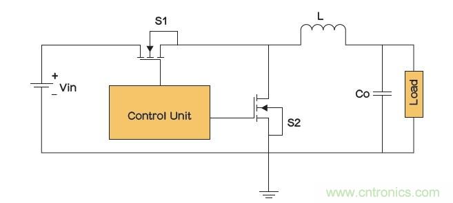 在一個同步降壓轉換器(圖4)內,集成肖特基二極管的功率MOSFET可以用作下橋臂開關(S2),以提高轉換器的總體性能。