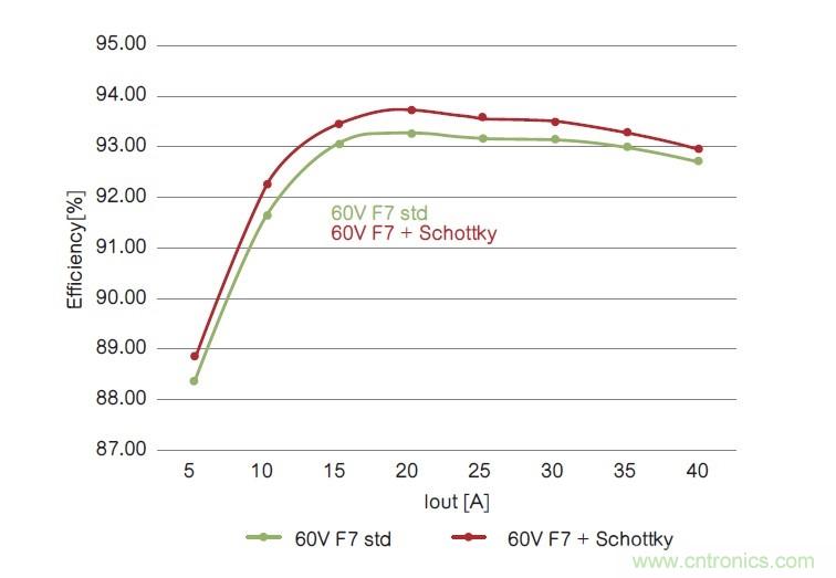 在兩個拓撲內,60V內置肖特基二極管的器件在整個電流范圍內性能表現更好,從而提高了系統總體性能。