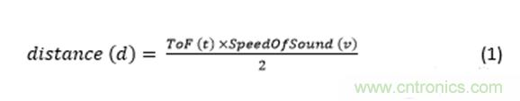距離(d)是從無人機上的超聲波傳感器到地面/物體的距離,ToF(t)是前面定義的ToF,而SpeedOfSound(v)是通過介質(zhì)的聲速。ToF(t)×SpeedOfSound(v)除以2,因為ToF計算超聲回波往返物體的時間。
