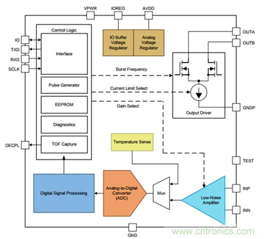 超聲波傳感技術(shù)也是一項具有成本競爭力的技術(shù),特別是在使用PGA460等集成解決方案時,其中已包括大部分所需的芯片。PGA460既可以使用半橋或H橋直接驅(qū)動傳感器,也可以使用變壓器驅(qū)動傳感器;后者主要用于密封的的“密閉”傳感器。PGA460還包括用于接收和調(diào)節(jié)超聲回波的完整模擬前端。此外,該器件還可以通過數(shù)字信號處理來計算ToF(見圖4)。