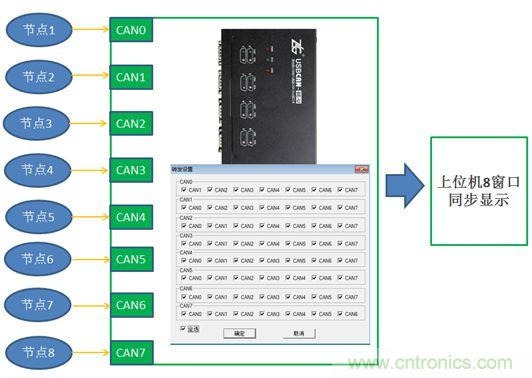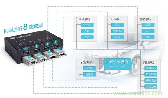 若將每個節(jié)點單獨取出做測試,則必然破壞原有通信規(guī)則。如何在不破壞原有通信的基礎上搞清楚一個陌生的收發(fā)協(xié)議呢?所謂工欲善其事,必先利其器。您需要一個能同時收發(fā)、轉送多路CAN數(shù)據的CAN卡,USBCAN-8E-U正是為這種應用而生。