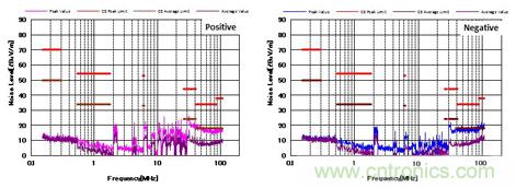 圖4顯示了增加CM和DM濾波器后的噪聲特性。 與圖3相比,CM濾波器的增加降低了近20dBμV/ m的CM噪聲。 并且EMI性能也通過了CISPR25 C5標準。