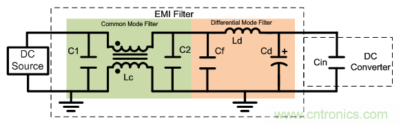 圖1是一個簡化的EMI濾波器,包括共模(CM)濾波器和差模(DM)濾波器。 通常,DM濾波器主要用于濾除小于30MHz的噪聲(DM噪聲),CM濾波器主要用于濾除30MHz至100MHz的噪聲(CM噪聲)。 但其實這兩個濾波器對于整個頻段的EMI噪聲都有一定的抑制作用。