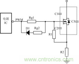 關斷瞬間驅動電路能提供一個盡可能低阻抗的通路供MOSFET柵源極間電容電壓快速泄放,保證開關管能快速關斷。為使柵源極間電容電壓的快速泄放,常在驅動電阻上并聯一個電阻和一個二極管,如圖3所示,其中D1常用的是快恢復二極管。這使關斷時間減小,同時減小關斷時的損耗。Rg2是防止關斷的時電流過大,把電源IC給燒掉。