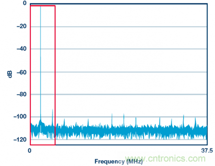 有多種方法可以減少落入紅框內(nèi)的噪聲量。其中一種是選擇具有更好SNR(噪聲更低)的ADC。或者也可以使用相同SNR的ADC并提供更快的時(shí)鐘(比如150 MHz),從而讓噪聲分布在更寬的帶寬內(nèi),使紅框內(nèi)的噪聲更少。