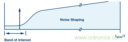 Σ-Δ型調(diào)制器通過對反饋回路(量化器輸出)調(diào)制,進(jìn)而實(shí)現(xiàn)對量化噪聲整形,,從而降低目標(biāo)頻段內(nèi)的噪聲,但代價(jià)是增加帶外噪聲,如圖3所示。