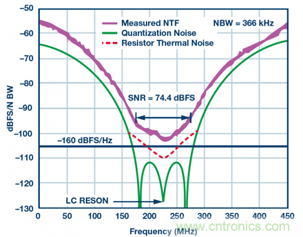 即使不進(jìn)行完整分析,也可以看到,對于Σ-Δ型調(diào)制器,使用NSD作為確定帶內(nèi)可用動(dòng)態(tài)范圍的規(guī)格尤為有效。圖4顯示的是高速帶通Σ-Δ型ADC放大后的噪底曲線。在75 MHz目標(biāo)頻段內(nèi)(中心頻率為225 MHz),噪聲為-160 dBFS/Hz左右,SNR超過74 dBFS。