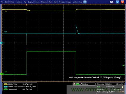 a) 由于有限的控制回路速度,負載電流的快速變化會導致輸出電壓的變化。有時內部調節回路無法對電流的快速變化(由于時間延遲)作出反應,就會導致通常約為幾十毫伏(mV)的下沖/過沖。