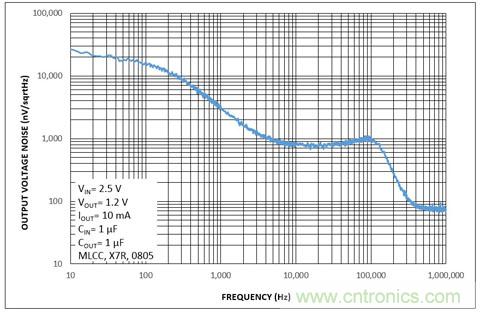 c)半導體結構自身會產生固有的噪聲,主要是由自由原子與基礎材料晶體結構碰撞而引起。由于固有噪聲是一種半導體中與電流傳導原理相關的物理現象,因此可以通過一些技術來抑制,但是不可能將其徹底去除。現代LDO的輸出噪聲可以達到數以百計的微伏(uV)甚至更小,但是頂級LDO產生的噪聲就會達到微伏(uV)單位。