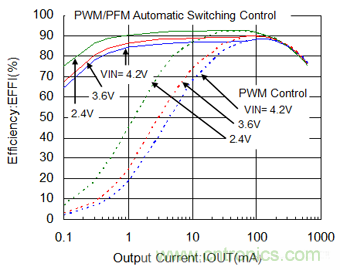 XC9236具有對應負載變化自動地轉換PFM工作和PWM工作的功能。這種功能可同時滿足輕負載時提高效率和重負載時保持低紋波,有利于在整個負載范圍提高效率。(參照圖4)