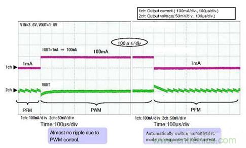 圖3 PFM控制和PWM控制自動轉換波形(負載電流:1mA⇔100mA)