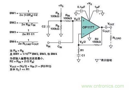 一種常用但不正確的方法是利用100 kΩ/100 kΩ電阻分壓器(加0.1μF旁路電容)提供VS/2給運(yùn)算放大器的同相輸入端。使用這樣小的電容值對(duì)電源退耦通常是不夠的,因?yàn)闃O點(diǎn)僅為32 Hz。電路出現(xiàn)不穩(wěn)定(“低頻振蕩”),特別是在驅(qū)動(dòng)感性負(fù)載時(shí)。