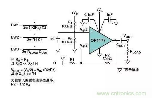 最后,單電源運(yùn)算放大器電路需要偏置共模輸入電壓幅度以控制AC信號(hào)的正向擺幅和負(fù)向擺幅。當(dāng)從電源電壓利用分壓器提供偏置電壓時(shí),為了保證PSR的性能就需要合適的退耦。