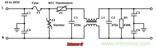 為了解決這一問題,最簡單方法加一個NTC熱敏電阻(如下圖1中的Z1)來減小涌浪電流的大小,此時通電瞬間的浪涌電阻相當(dāng)于電壓除以NTC熱敏電阻與濾波電容的等效串聯(lián)電阻之和