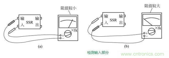 檢測固態(tài)繼電器時,將萬用表置于“Rx1K”檔,分別檢測其輸入部分和輸出部分。