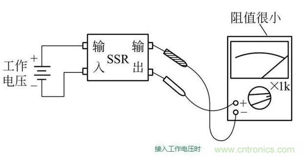 在上一步檢測的基礎上,給固態(tài)繼電器輸入端接入規(guī)定的工作電壓,這時固態(tài)繼電器輸出端兩引腳之間應該導通,萬用表表針指示阻值很小。