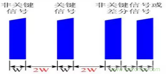4、時鐘線、總線、射頻線等關(guān)鍵信號走線和其他同層平行走線應(yīng)滿足3W原則。