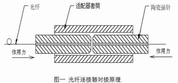 光纖連接器不能單獨(dú)使用,它必須與其它同類型的連接器互配,才能形成光通路的連接,目前,較為流行的光纖連接器裝配和對(duì)接方式為:利用環(huán)氧樹脂熱固化劑,將光纖粘固在高精度的陶瓷插針孔內(nèi),然后使兩插針在外力的作用下,通過適配器套筒的定位,實(shí)現(xiàn)光纖之間的對(duì)接(如圖一)。