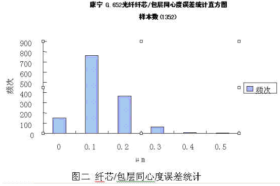 對(duì)于原材料之一的緊套光纜及光纖,成都康寧光纜全部采用美國康寧產(chǎn)光纖,依托康寧公司全球領(lǐng)先的光纜制造技術(shù),制造出國內(nèi)領(lǐng)先水平的緊套光纜,并用之于本公司的連接器跳線的生產(chǎn),確保光纖光纜原材料的品質(zhì)。圖二和圖三即是本公司采用的康寧公司G652光纖的主要特性參數(shù),其纖芯/包層同心度誤差和衰減系數(shù)統(tǒng)計(jì)值均遠(yuǎn)好于國內(nèi)相關(guān)行業(yè)標(biāo)準(zhǔn)的要求(行業(yè)標(biāo)準(zhǔn)的要求分別為≤0.5μm和≤0.5dB/km):