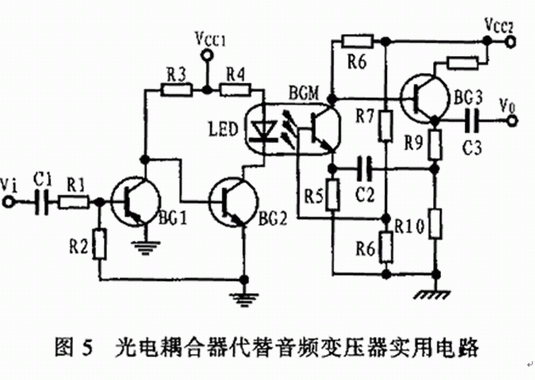 目前,利用光電耦合器代替音頻變壓器的應用電路有多種形式,圖5所示是比較實用的一種。當輸入信號Vi經三極管BG1、BG2前級放大之后,驅動光電耦合器左邊的LED發光,并被右邊的光敏管全部吸收并轉換成電信號,此信號經后級電路BG3放大,并由該管的發射極通過電容器C3后輸出一個不失真的放大信號 V0。由于該電路將前后兩級放大器之間完全隔離,因而杜絕了地環路可能引起的干擾。同時由于該電路還具有消噪功能,因此避免了信號的失真。整個電路的總增益可望達到20dB以上,帶寬約120kHz。