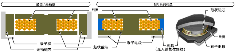 • NR 系列采用了混入鐵氧體粉末樹脂的成型技術,只使用了鼓型磁芯形成了無袖構造產品