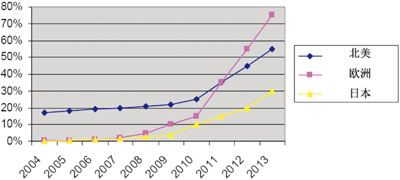 汽車導航市場中,根據ST公司的估計,2008年PND的出貨量同比將增長43%,從2007年的3200萬件增長到4600萬件。主要增長動力依然來自車載導航市場的低于水準的普及率,對市場的教育和推廣的力度依然不夠。低成本的OEM導航儀(兩用便攜導航儀)將會在中級汽車中開辟新的市場,預計到2012年在歐美新售的汽車中,車載導航儀占有率將超過25%。2007-2013年OEM儀表板內置導航儀的年均增長率將達到15%,便攜式導航儀的增長速度為16%,預計到2013年導航市場規模將達到汽車影響的水平。