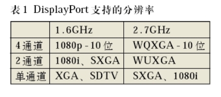 DisplayPort是一個高帶寬、雙向顯示互連,可以實現內置和外置顯示連接的通用新一代接口標準。憑借可擴展SerDes技術及改變通道數和速度,顯示系統可采用DisplayPort接口標準來支持各種分辨率,使其成為數字電視的理想選擇。表1顯示了一些由不同速度和通道數支持的DisplayPort的分辨率實例。