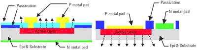 對背面發光的LED,其激活層在透明基底上生長,摻雜程度取決于所要求的發射光波長。發光區域在晶片制造工藝中確定,基底在器件上保持不變。