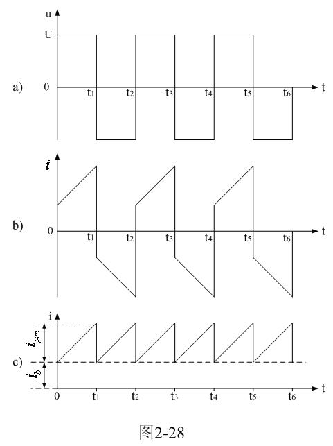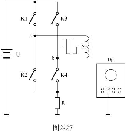 圖2-27中,U是電源電壓,N為變壓器初級線圈,控制開關K1、K2、K3、K4組成橋式開關控制電路,K1和K4為一組,K2和K3為一組,兩組開關輪流接通與斷開,把電源電壓正反向加于變壓器初級線圈兩端;R為取樣電阻,通過測量R兩端的電壓,就可以知道流過變壓器初級線圈的電流;取樣電壓被送到示波器Dp進行顯示。