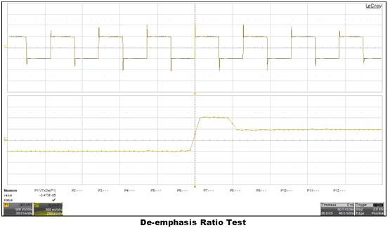 為了把5Gbps速率的數(shù)據(jù)傳送較遠的距離,USB3.0的發(fā)送端使用了去加重技術,這項測試可以測量DUT的去加重程度是否滿足規(guī)范要求(要求在-3dB到-4dB之間)。測試時DUT發(fā)送出CP7碼流,CP7碼型由50-250個連續(xù)的1和50-250個連續(xù)的0重復交替組成,而且是添加了去加重的信號波形。圖3為某USB3.0芯片的去加重測量結果,該芯片采用了-3.47dB的去加重。