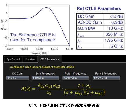 USB的官方組織規(guī)定了USB3.0使用的CTLE均衡器的參數(shù),如下圖7左上部分為均衡器的頻響,右上方的表格是均衡器的參數(shù),下方是力科示波器中集成了USB3.0的均衡器參數(shù),可方便調用。