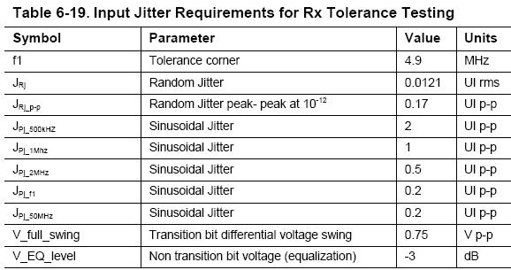 在接收機測試中,碼型發生器和待測試芯片的擴頻時鐘功能(SSC)都打開,輸出信號的特征需滿足下圖3所示:信號的峰峰值大于750毫伏,-3dB的去加重,隨機抖動的RMS值為0.0121UI(Unit Interval的簡稱,即1個比特的時間),即0.0121*200ps = 2.42ps,添加的正弦抖動的頻率為500kHz、1MHz、2MHz、4.9MHz、50MHz,其對應的抖動峰峰值為2UI、1UI、0.5UI、0.2UI、0.2UI。要求在添加了上述數量的隨機抖動和正弦抖動后誤碼率小于 。其中,頻率低于500KHz的抖動大于2個比特,說明USB3.0芯片的接收端需具備較強的抖動過濾能力,因為多數開關電源工作在這個頻段。